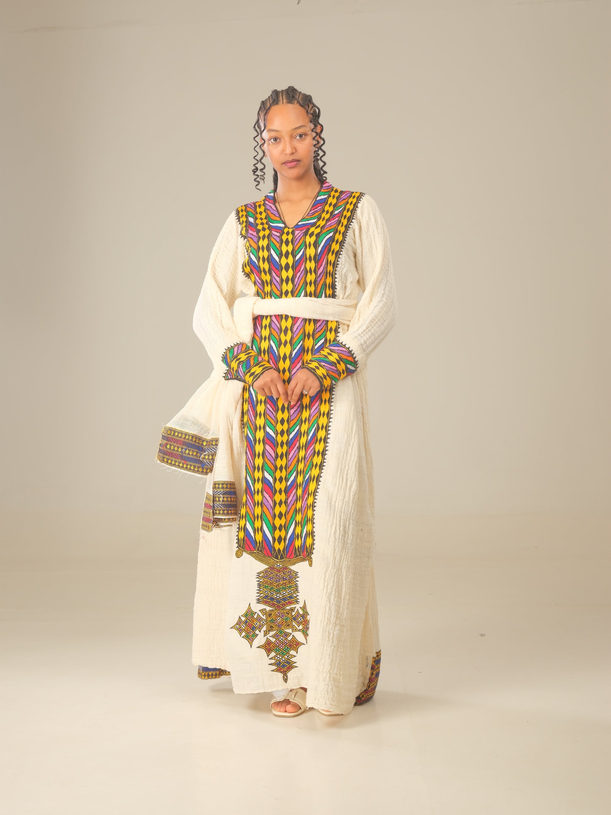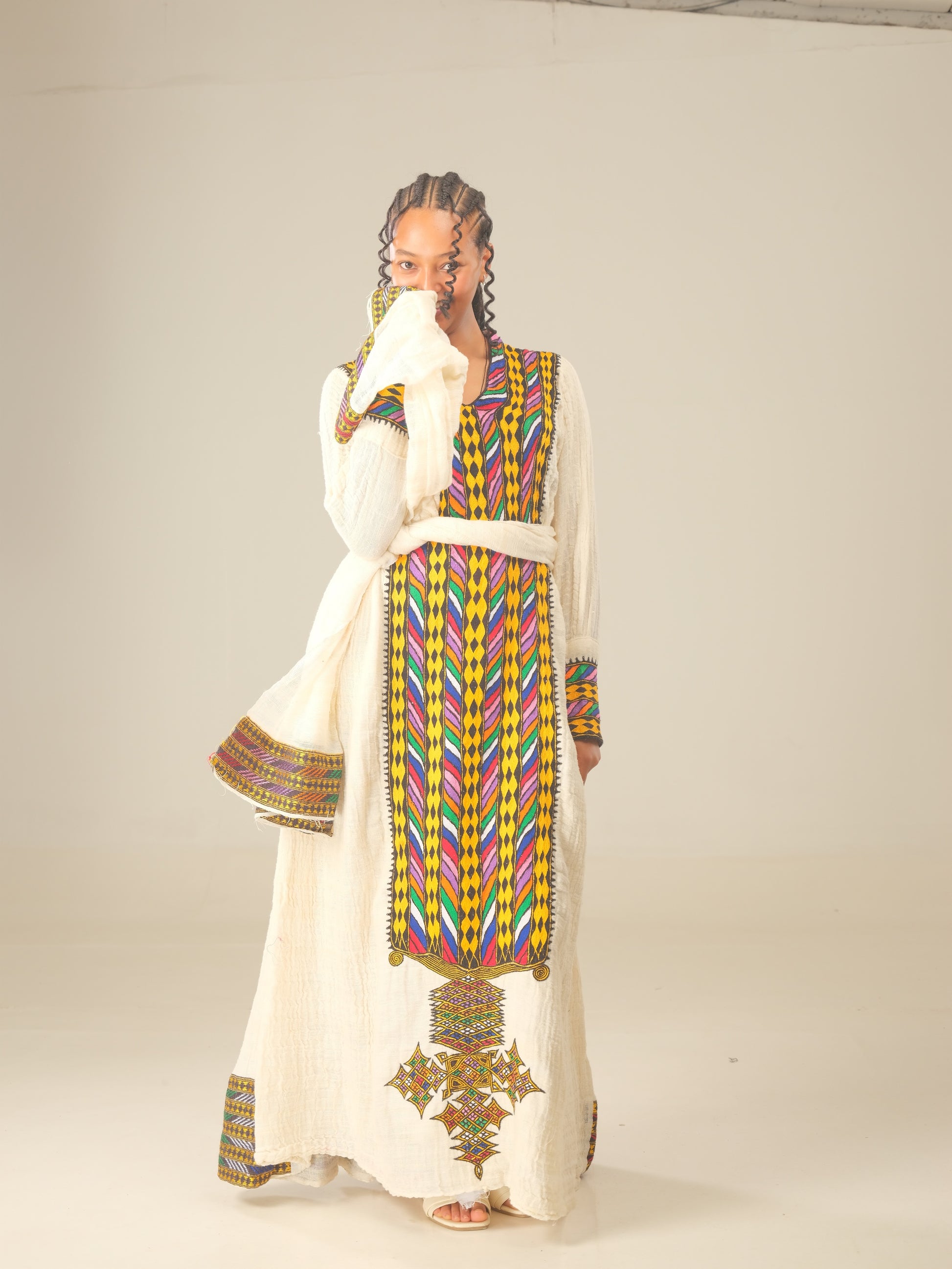 Intricate Yellow Hand Embroidery: The dress is adorned with beautiful, detailed hand embroidery in a rich yellow hue, paying homage to Axum’s historic artistry and Ethiopian tradition.
