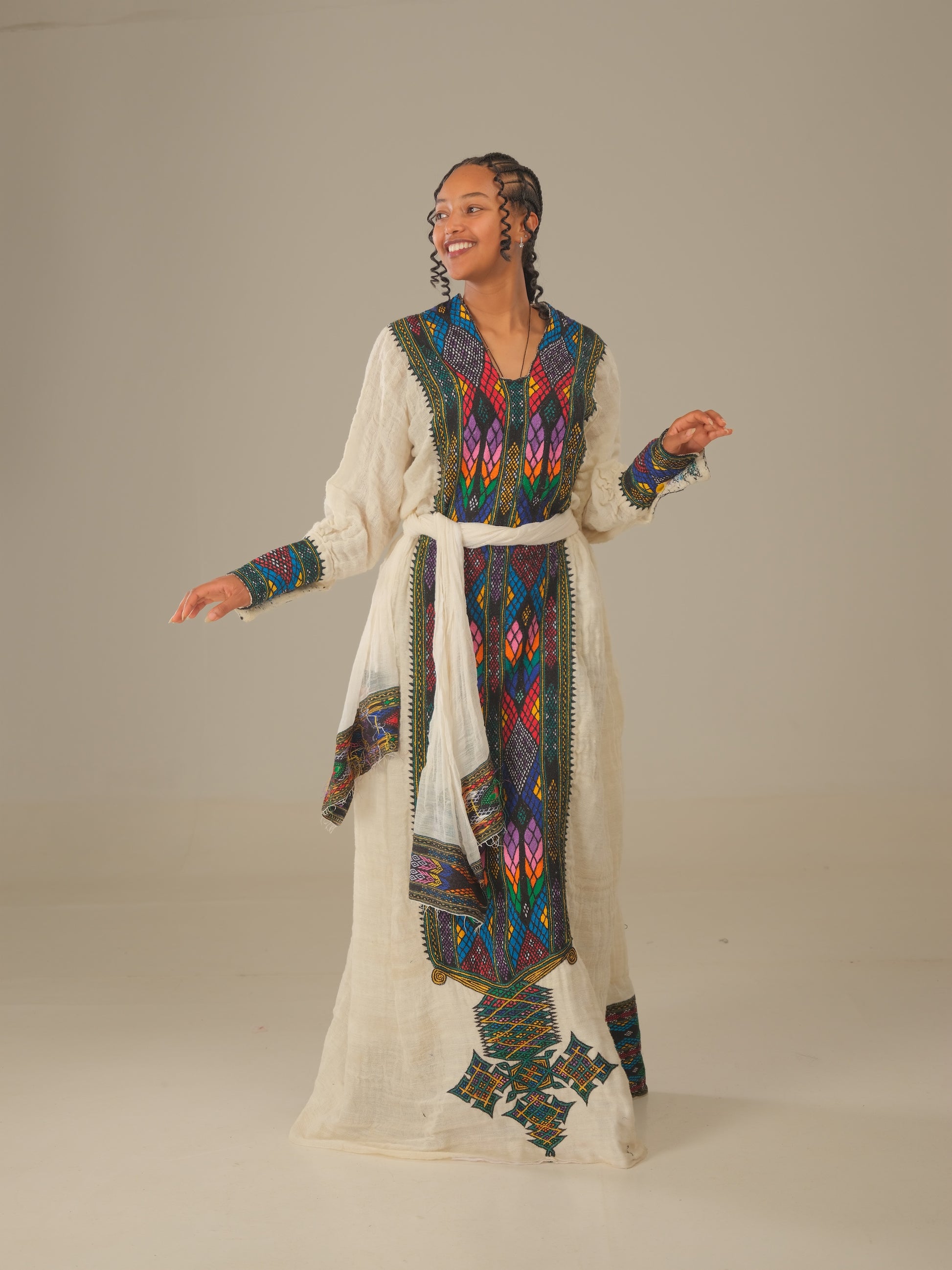 Celebrate the beauty of Ethiopian craftsmanship with the Dark Green with Purple Embroidery Axum Dress — a true luxury piece that combines tradition with modern sophistication for your most special occasions.