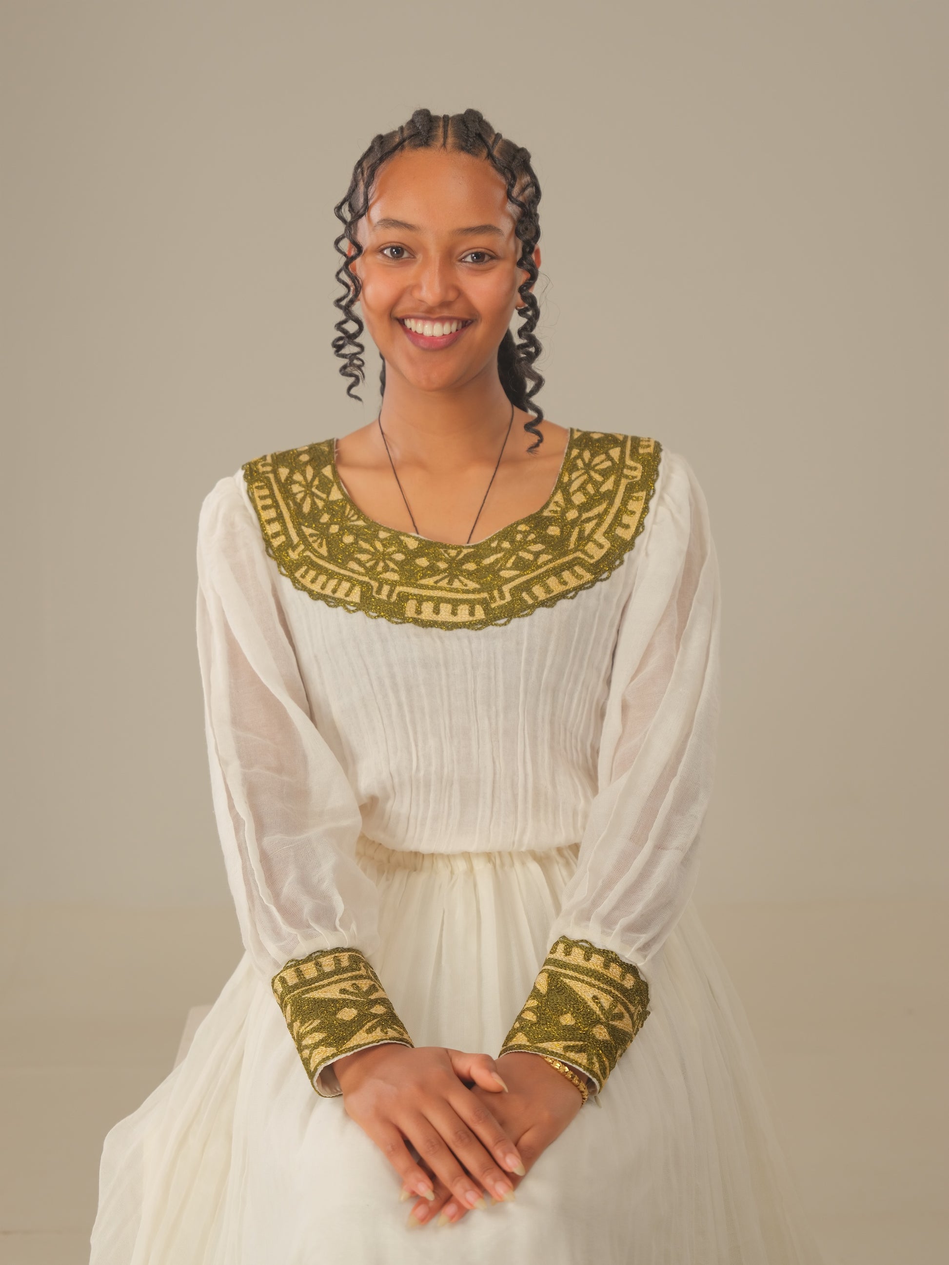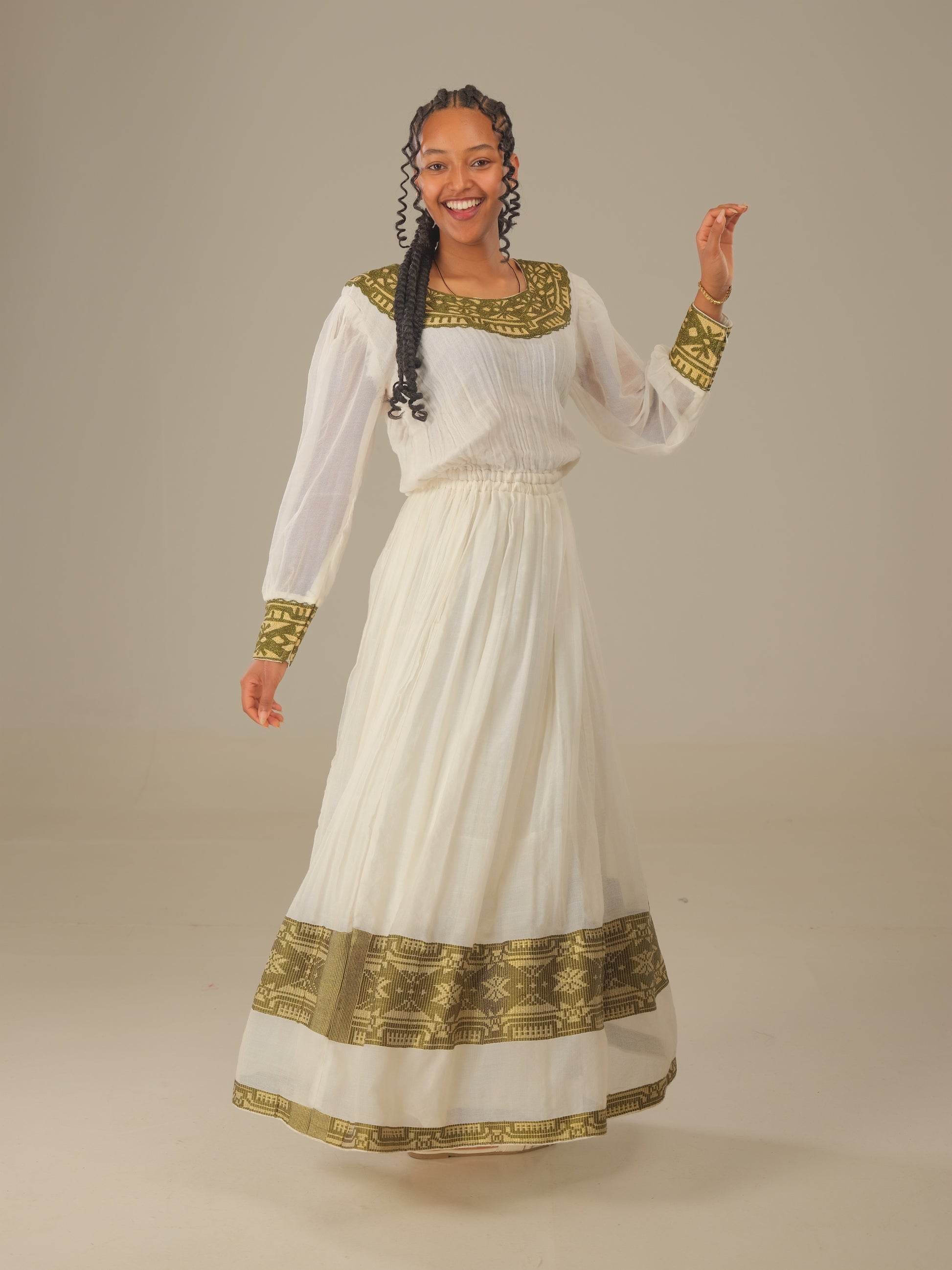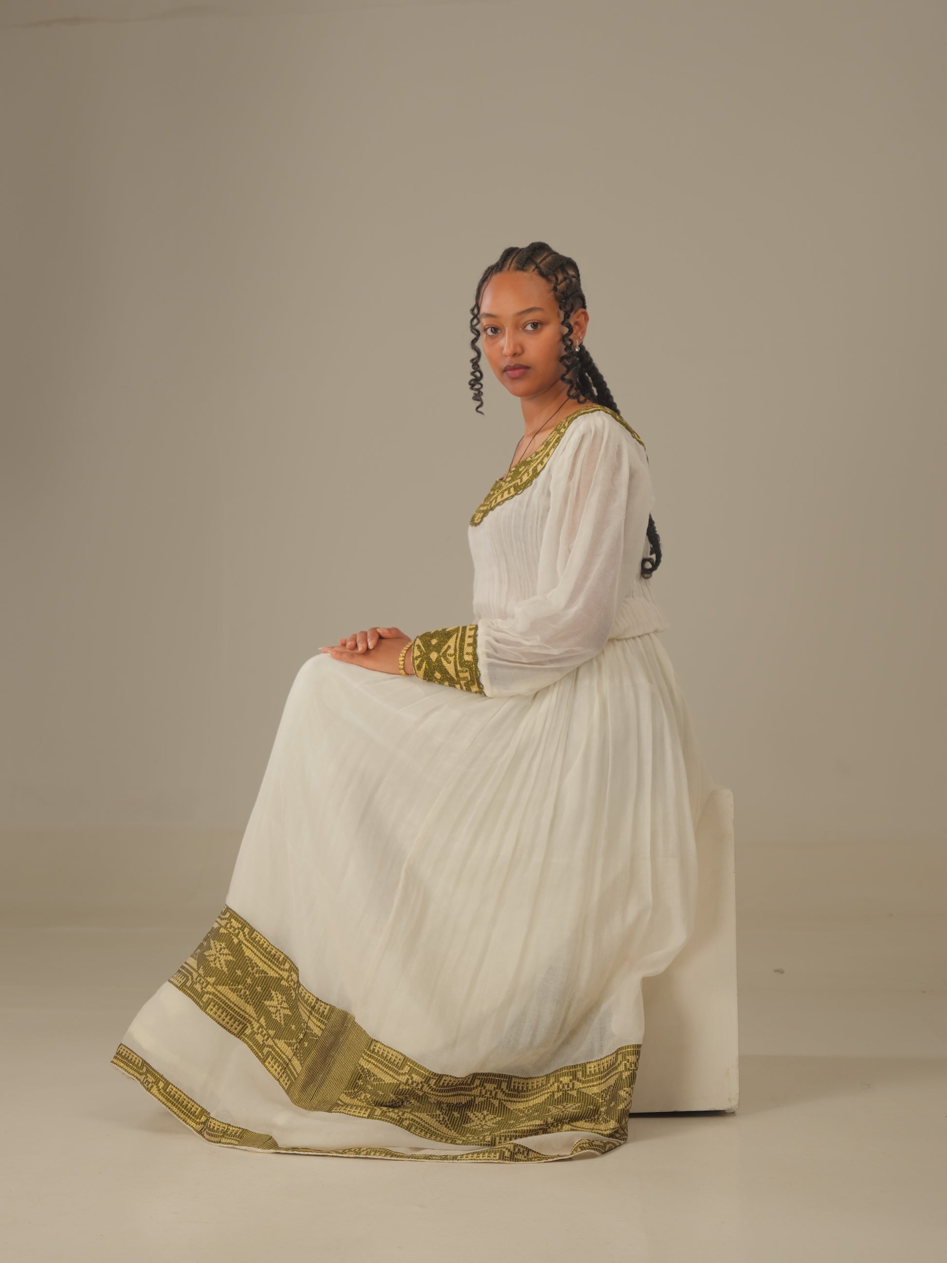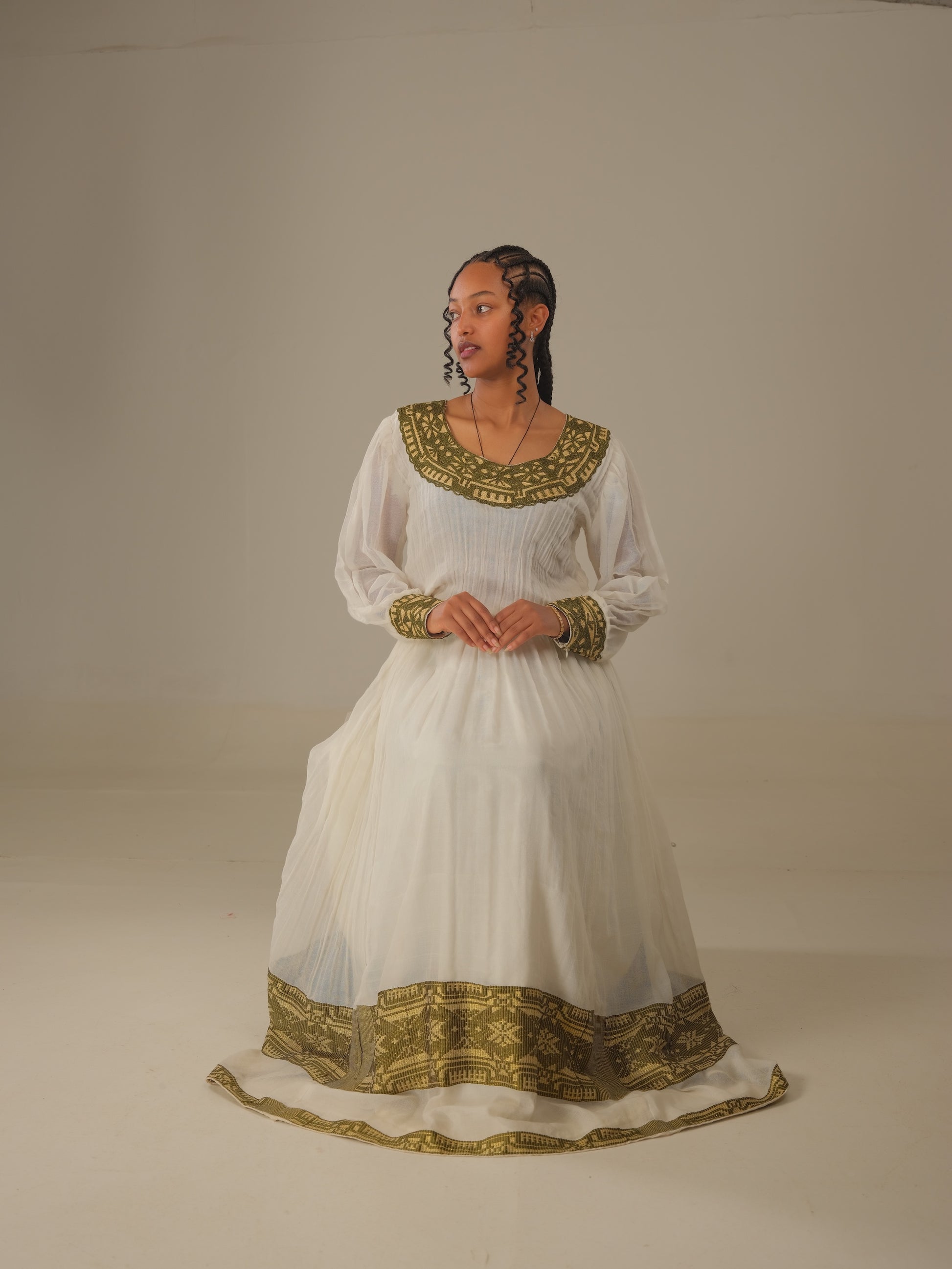 Celebrate the beauty of Ethiopian culture with the Green with Gold Tibeb Habesha Dress — a luxurious piece perfect for any event where you want to make a statement.