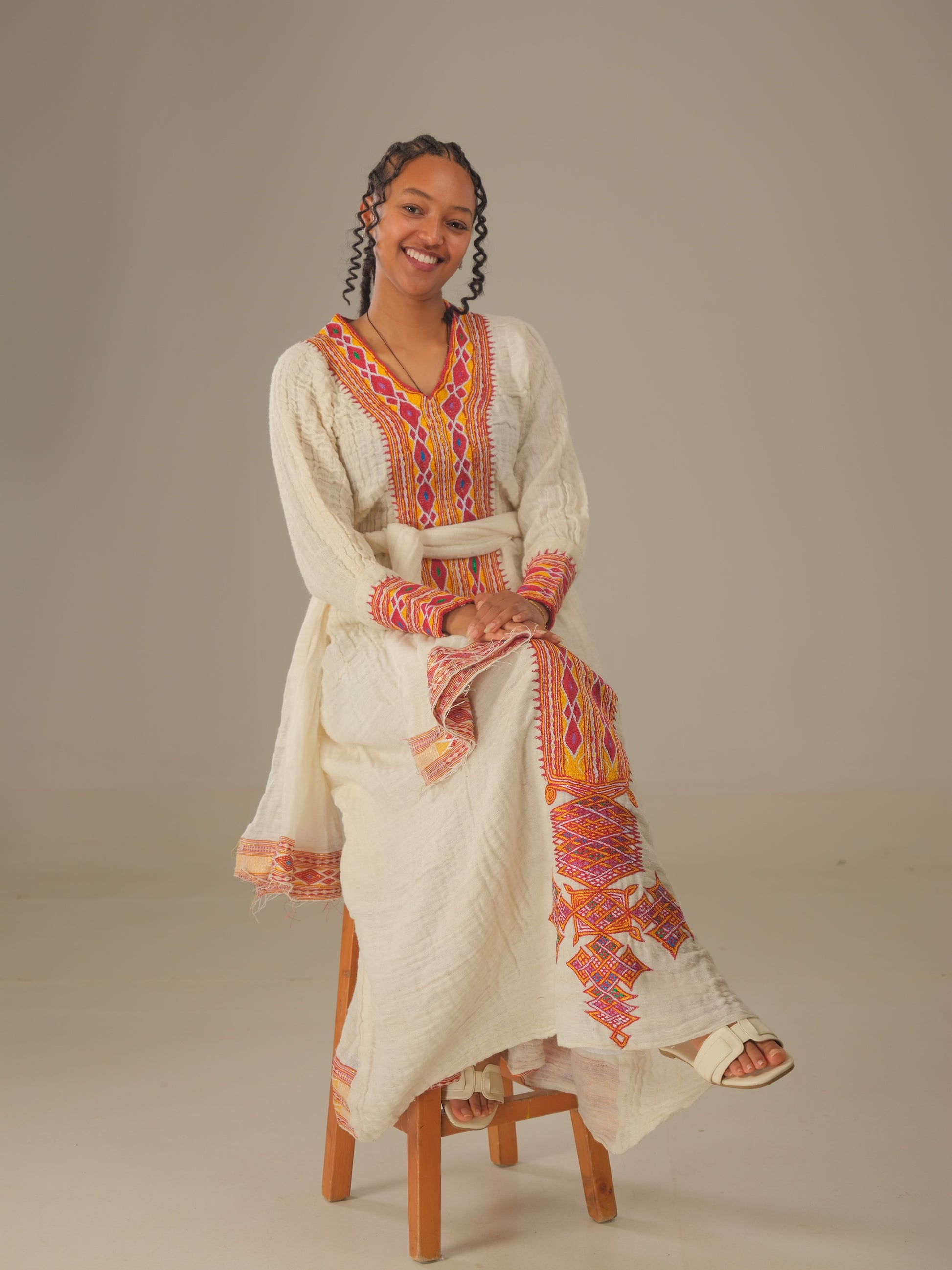 Immerse yourself in the rich history of Axum with this stunning Orange Tilf Habesha dress. A true masterpiece of Ethiopian craftsmanship, this dress features intricate hand embroidery that highlights the ancient Axumite culture while embracing modern elegance. With its vibrant orange hue and meticulous detailing, this dress is perfect for cultural celebrations, weddings, and other special occasions that call for a unique blend of tradition and sophistication.