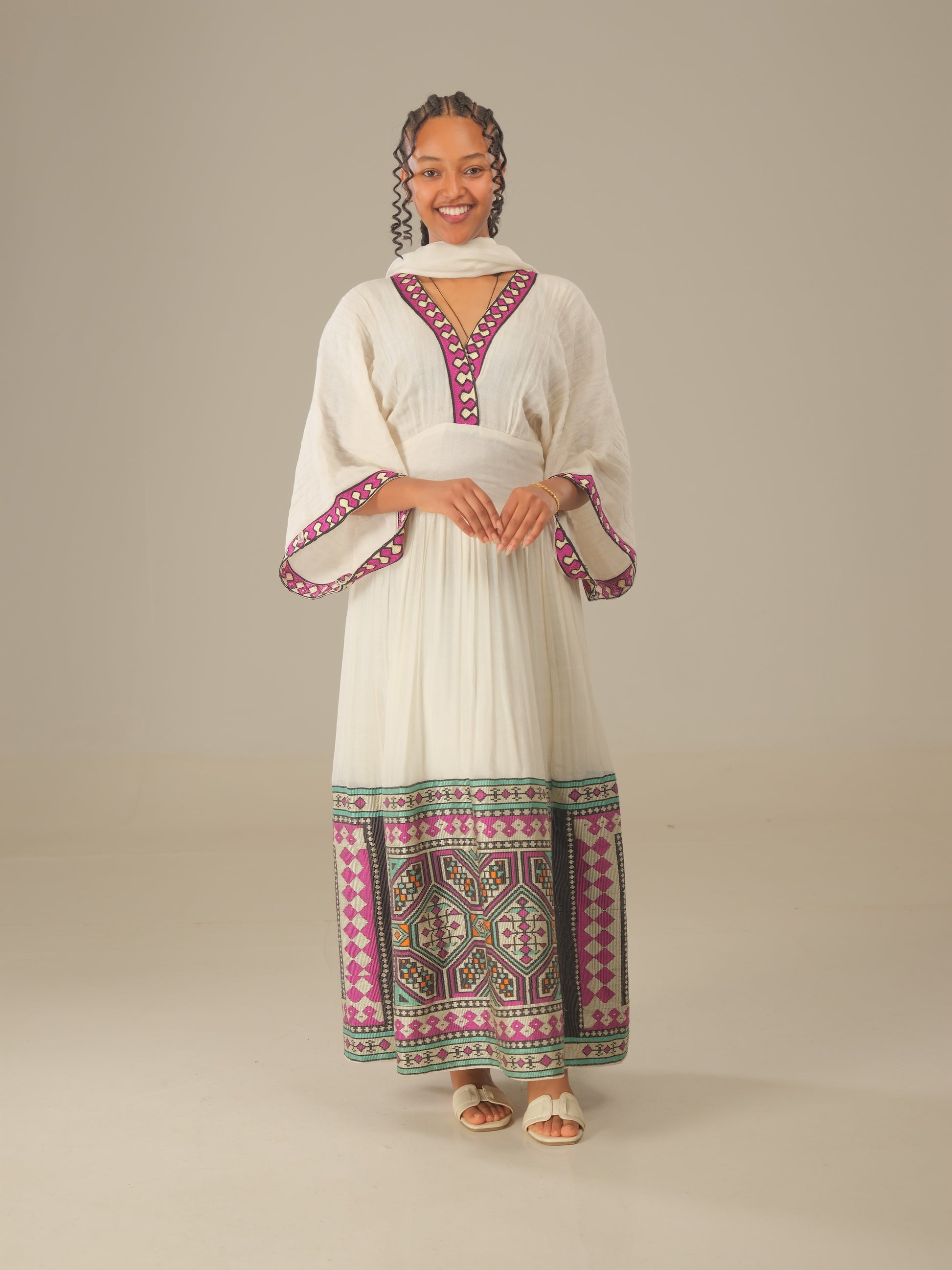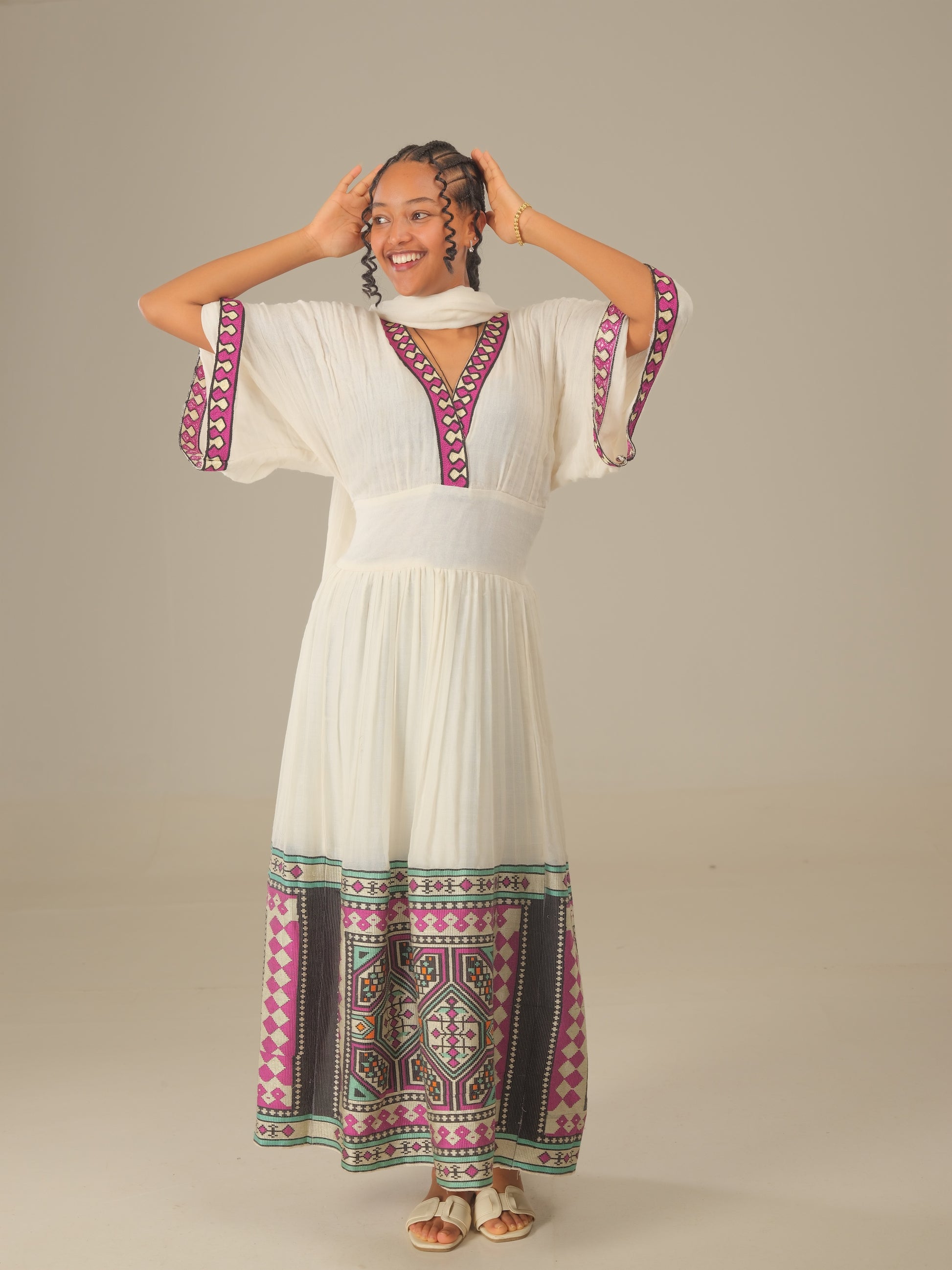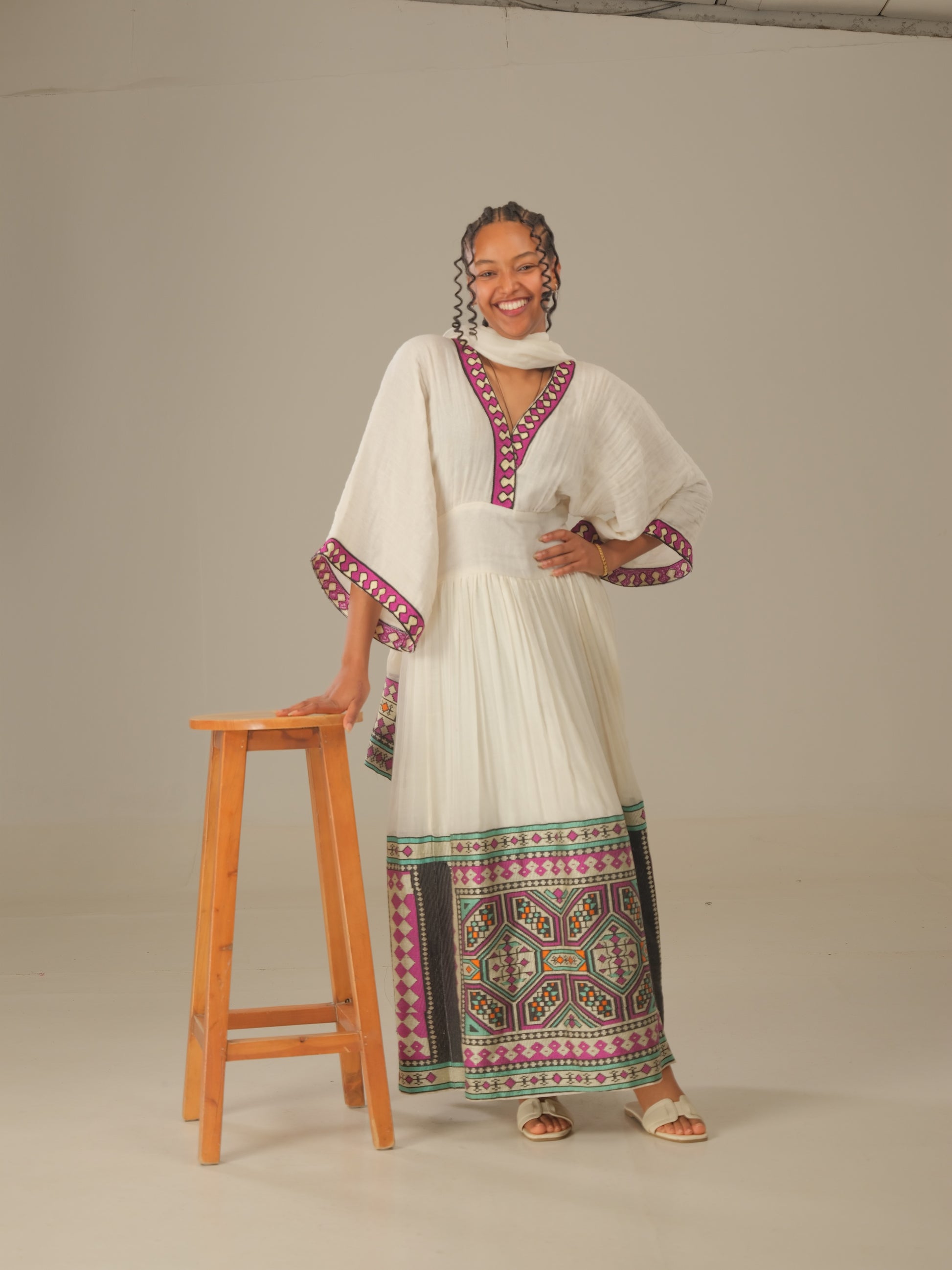 Experience the regal elegance of the Royal Blue with Purple Tibeb & Embroidery Habesha Dress, a stunning embodiment of Ethiopian tradition and luxury. The deep royal blue fabric, paired with rich purple tibeb and intricate embroidery, exudes sophistication and grace. Handwoven with meticulous care, this dress reflects the timeless beauty of Ethiopian craftsmanship. Perfect for weddings, cultural events, or any special occasion, it makes a bold statement while honoring Ethiopia’s rich cultural heritage.
