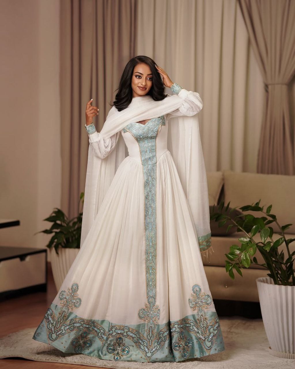 Sky Blue Embroidered Ethiopian Event Dress & Netela – Grace in Every Thread | Shiromeda Threads