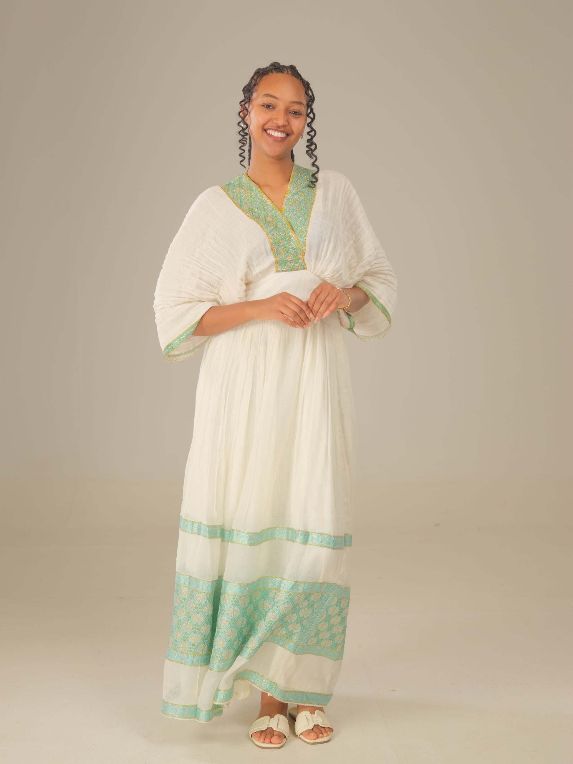 Experience the serene beauty of Ethiopian craftsmanship with this stunning Sky Blue Habesha Tibeb Dress. Designed for those who appreciate the balance of tradition and modern style, this handwoven dress features intricate embroidery that enhances its tranquil sky blue hue. Perfect for cultural celebrations or formal occasions, this piece brings together sophistication, comfort, and timeless Ethiopian artistry.