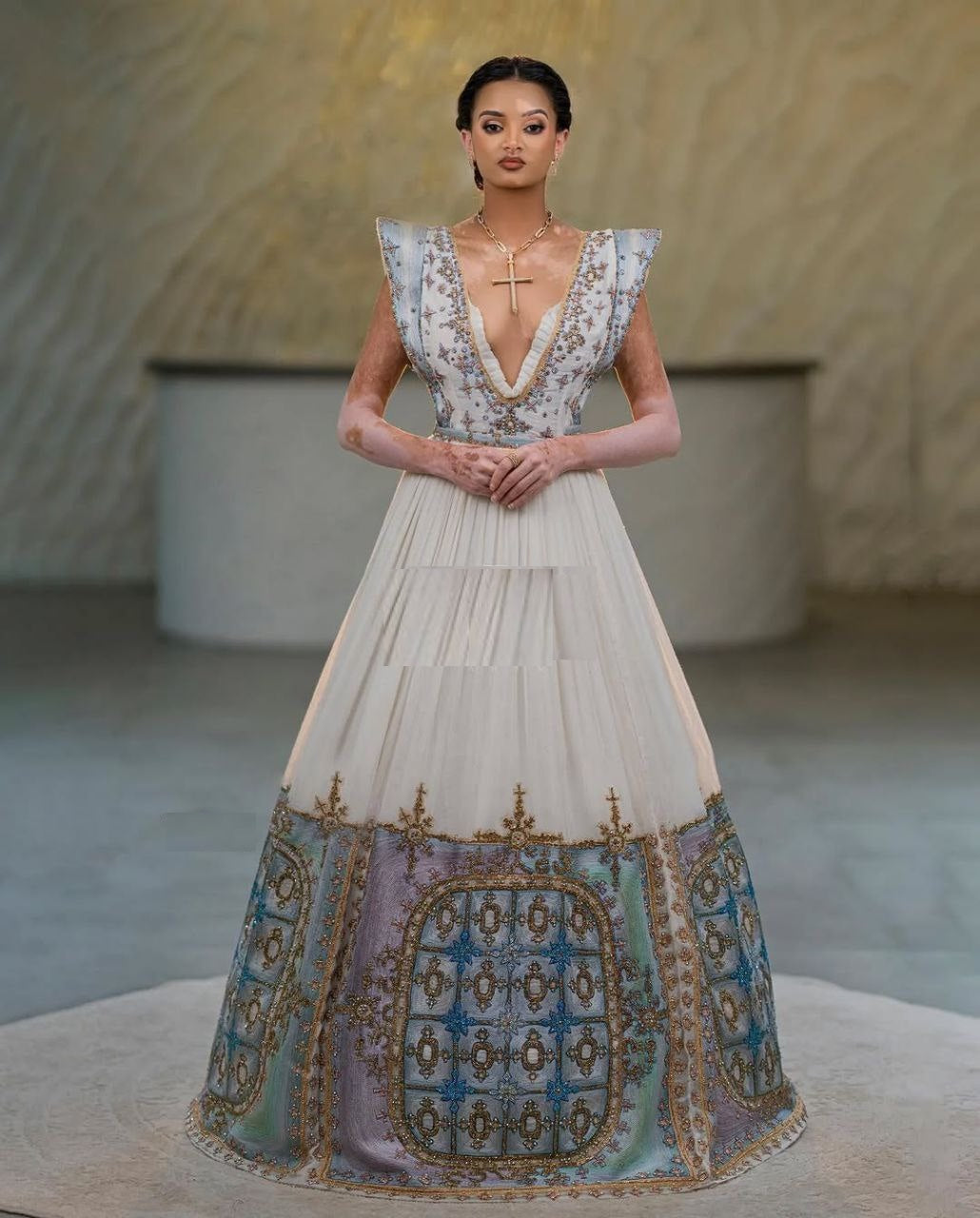 Step into elegance with this modern sky blue Ethiopian dress, where tradition meets sophistication in every stitch. Designed for the bride or celebrant who wants to shine, this gown features very detailed embroidery enhanced with shiny stones that catch the light and elevate the look to true occasion wear.